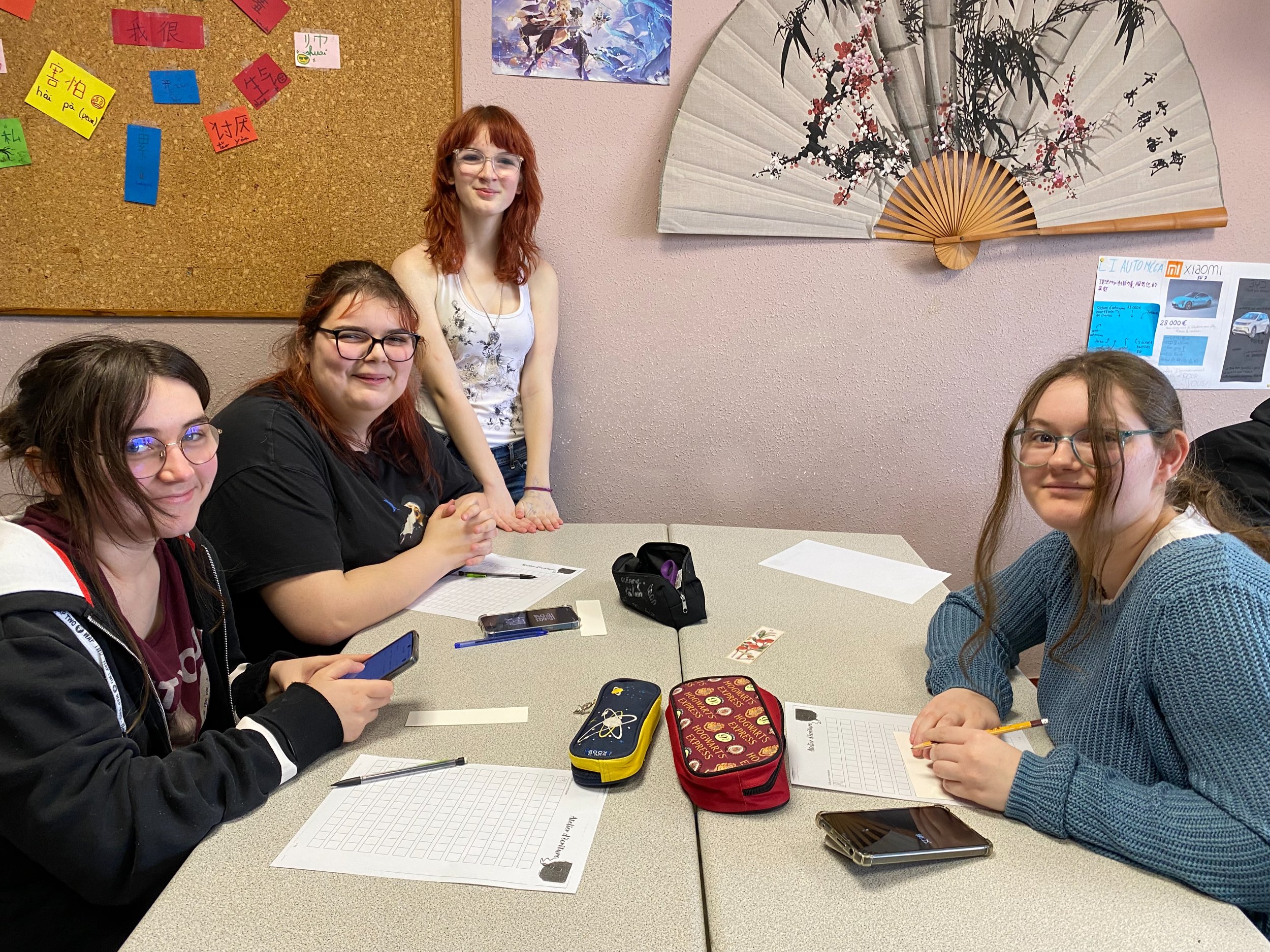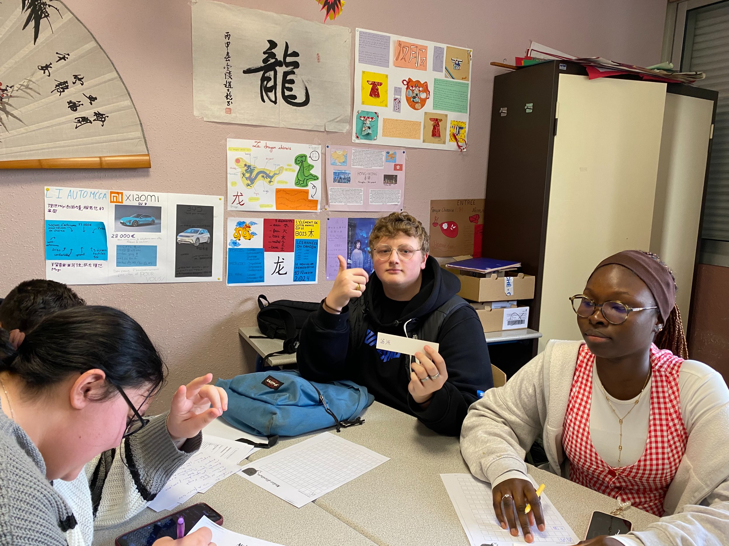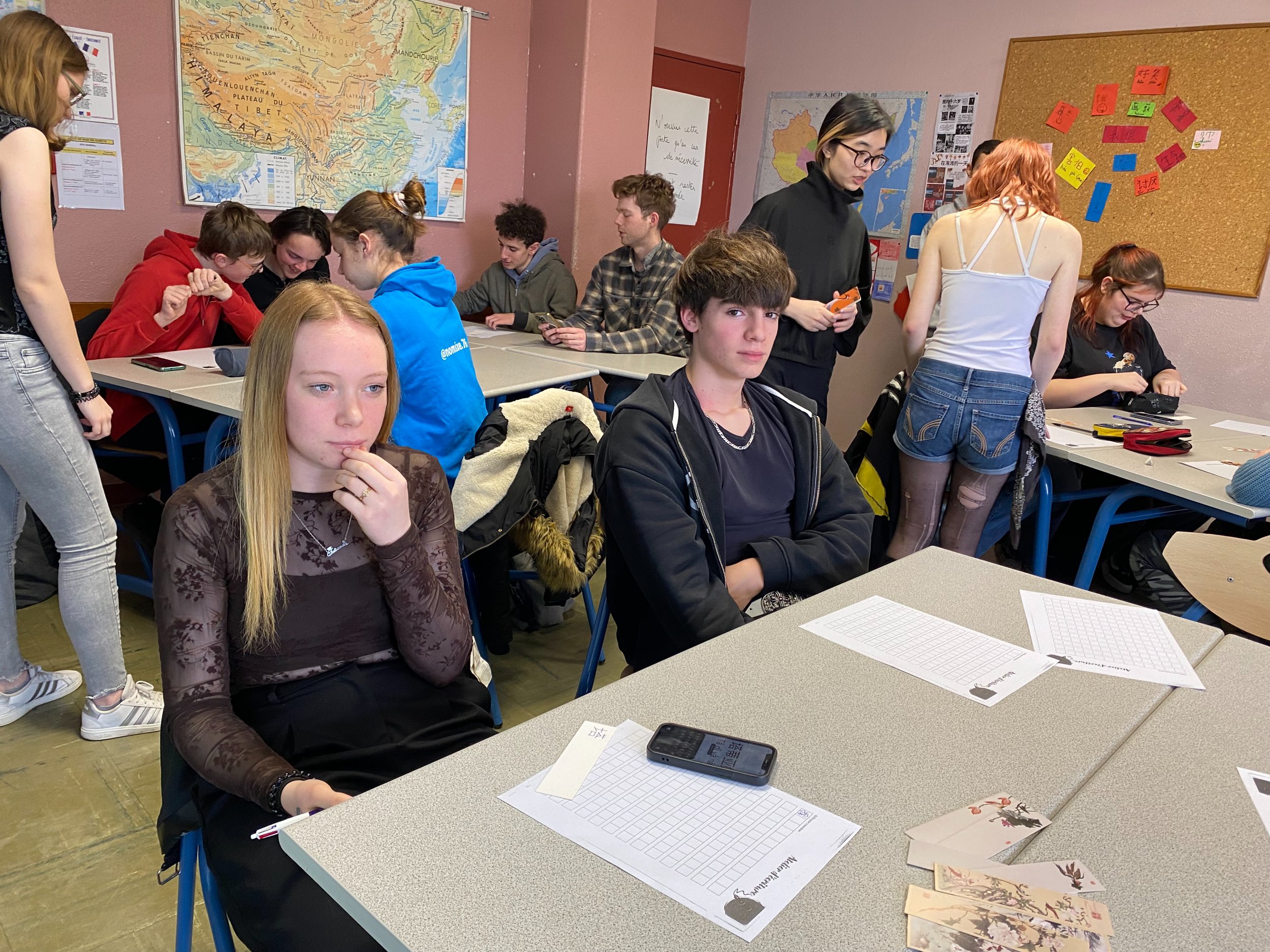 Une première rencontre entre les élèves a été organisée au mois de janvier, autour d’exposés réalisés par les élèves de 1ère option chinois, portant sur le nouvel an chinois, les différentes recettes de fabrication des raviolis, suivie d’un atelier d’écriture permettant aux élèves de CAP PSR de se familiariser avec la calligraphie chinoise, en écrivant leur prénom sur un marque page décoré.